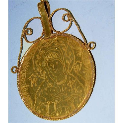 Rare and unusual 18th century hand crafted 22kt yellow gold icon pendant. The front bears a fantastic engraved depiction of the Virgin Mary the verso an equally skilled engraving. The thin round sheet of gold is reinforced and adorned with a hand soldered solid gold rope twist border which spiral as they flank the loop, also expertly hand worked and hand soldered into place at the hump of the loop there is a stamped maker's mark.<P>