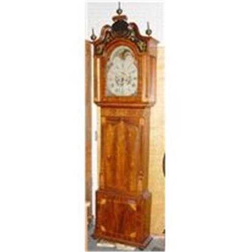 Rare 18th century English moonphase tall case grandfather clock crafted by Winder and Houghton Chorley, measuring 95 inches tall, 23 inches length and 10 inches width, with original brass ball spire finials, detailed bonnet, hand painted moon phase dial, with hand forged open work hands, subsidiary second function as well as date of the month function on a 2 weight drive train movement which chimes on the hour. The case is hand crafted from flame mahogany and satin inlays the lockable door crafted in Gothic form. There is crazing on the dial consistent with normal wear due to age and old restoration to the wooden finial just above the Winder Chorley signature. The movement is very solid and the clock keeps accurate time and this clock would make a wonderful addition to any fine collection or household.
