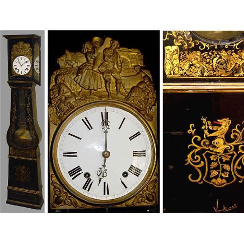 18c Normandy France Grandfather Clock Long Case 18th century Normandy France tall case grandfather clock with a signed case, period French movement, robust bell chime on the half and on the hour, in an ornate hand painted family crest adorned signed case with a high relief brass scene depicting the harvesting of grapes for the making of wine, with a white enamel dial with fancy hands and hand painted Roman numeral hour designations, with an impressive bay window to view the steady wag of the tremendous pendulum, below which is the wolf a top a knights armor ravenously eating lush grapes off the vine. SIZE: 98 inches heightx 22 inches width x 8.25 inches depth. CONDITION: Very good, working keeps great time, bell has a rich sound.