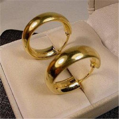 18ct yellow gold ear hoops, with click bar top for pierced ears. Marked 750 (18 ct gold). Excellent condition. Hollow, so not heavy on the ear. 1980s-90s. Hoops are 2.2 cm diameter (7/8 inch).