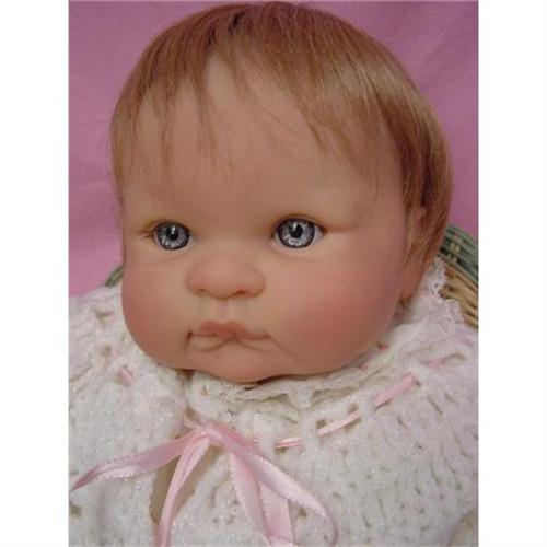 18in Artist Reborned Berenguer Babydoll, Mint. Cute baby with rosy complexion, blue realistic eyes, and ght brown hair. She has cloth body and vinyl head, arms and legs. She has been artistically blushed in all the right places for that realistic look. Baby comes dressed in rosebud print dress and crocheted sweater. She is a very sweet babydoll , you will treasure! (Item #80000281)