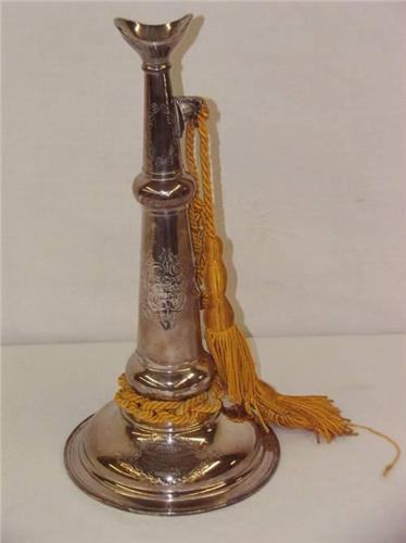18" SILVER PLATED FIRE TRUMPET - READING TELEGRAM and NEW TIMES TROPHY AWARDED TO LARGEST and BEST APPEARING CO. KING FROST CARNIVAL HAMBRUG PA OCT. 31, 1914 W/ FIRE HELMET TASSEL HOLDERS and GOLD TASSEL - (1) TASSEL HOLDER MISSING, MINOR DENT and LOSSES;
