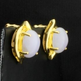 In 18K yellow gold, each earrings contains a 10x6mm oval moonstone with excellent color! They are about 1/2 inch long. 7.0g