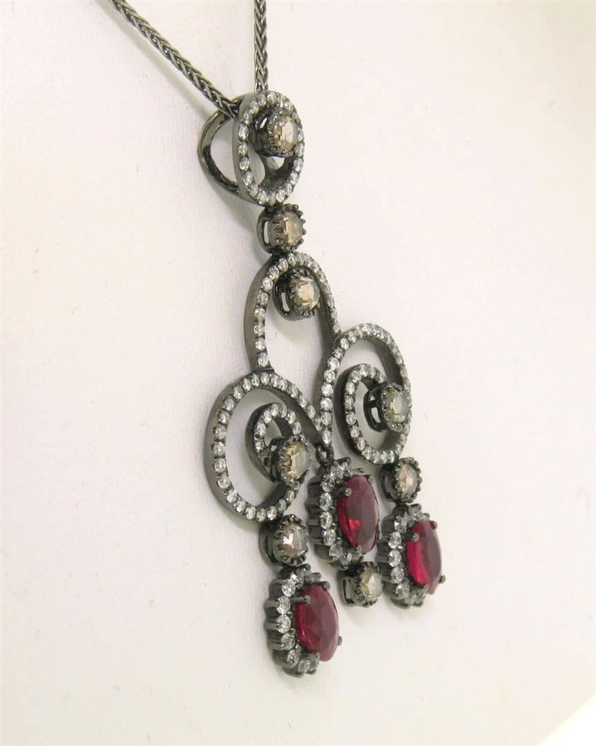 An estate solid 18k white gold and balck rhodium pendant necklace, with 3 oval cut natural rubies (1.80ctw), 147 round brilliant cut natural diamonds (G-H - SI1-SI2 ; 1.47ctw), and 8 rose cut natural diamonds (1.12ctw).The pendant weighs a total of 8.90 grams, measures 45x26mm including the bail, and 18 inch wheat link chain.