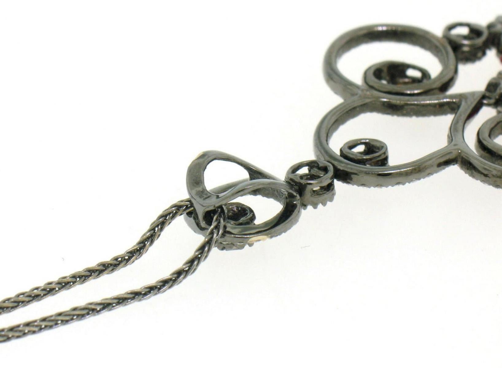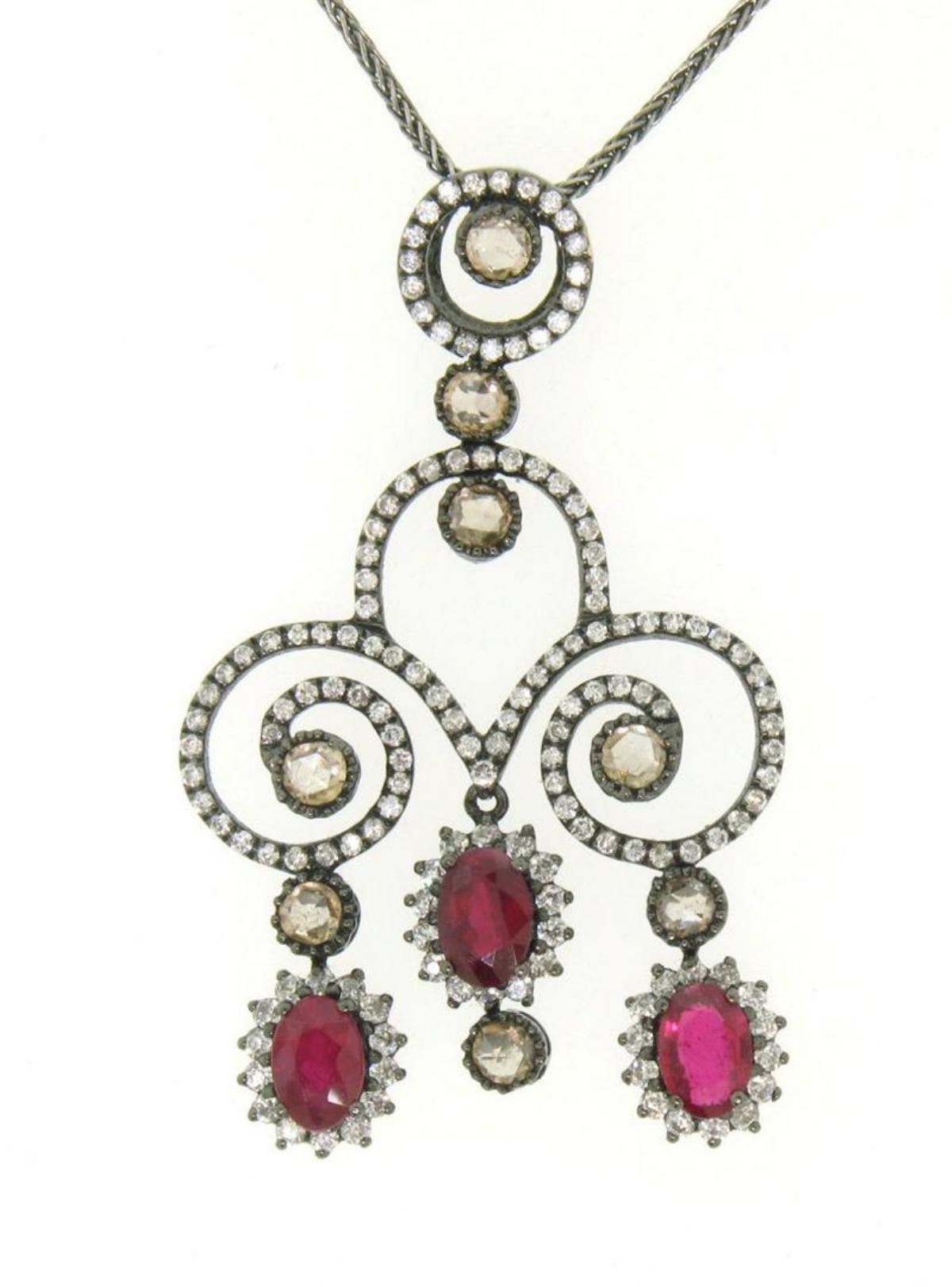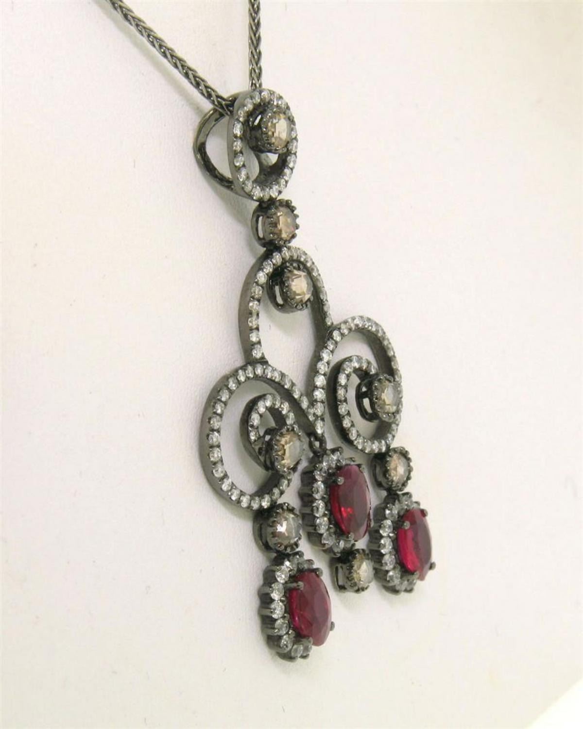One 18k Black Gold 4.39ctw Rose Diamond and Blood Ruby Edwardian Style Necklace. Item Details: Material: 18k Solid Black Gold  ( This is solid 18k white gold with black rhodium), Weight: 8.90 Grams, Stone: Natural Genuine Diamond (155) There are 147 small round brilliant diamonds perfectly pave set. They have a G-H Color and SI1-SI2 Clarity. They total 1.47ctw., There are also 8 Rose Cut diamonds that have a natural champagne color. They total approx 1.12 carats., Natural Genuine Rubies (3) Oval Cut rubies. All perfect match. Have a true BLOOD RED color. Very nice and transparent. They total approx. 1.80ctw., Chain: A solid gold wheat chain comes with along with the pendant as a perfect match. it has a detailed lobster clasp. Measures 18in. Long., Dimensions/Size: Pendant from the very top to bottom measures 1.80in. (45mm) and measures 1.05in (26mm) At the widest point., Condition: 100% LIKE NEW- Made to look old with the black rhodium.