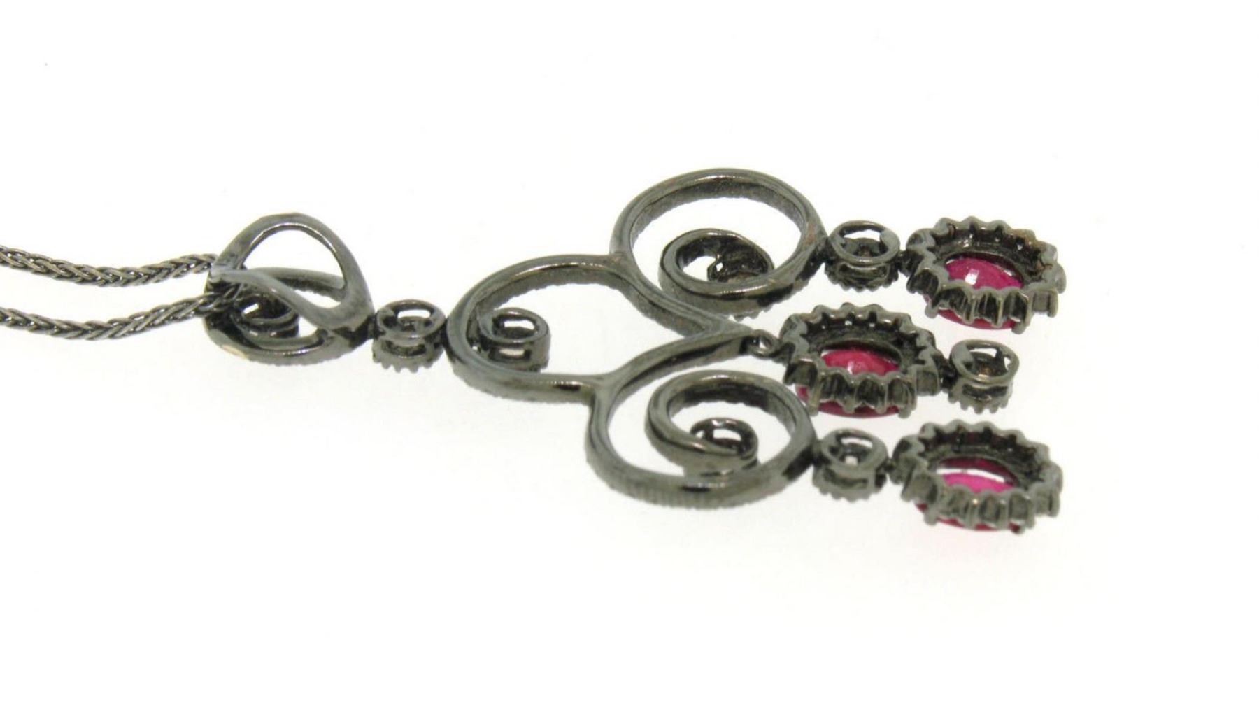 One 18k Black Gold 4.39ctw Rose Diamond and Blood Ruby Edwardian Style Necklace. Item Details: Material: 18k Solid Black Gold  ( This is solid 18k white gold with black rhodium), Weight: 8.90 Grams, Stone: Natural Genuine Diamond (155) There are 147 small round brilliant diamonds perfectly pave set. They have a G-H Color and SI1-SI2 Clarity. They total 1.47ctw., There are also 8 Rose Cut diamonds that have a natural champagne color. They total approx 1.12 carats., Natural Genuine Rubies (3) Oval Cut rubies. All perfect match. Have a true BLOOD RED color. Very nice and transparent. They total approx. 1.80 ctw., Chain: A solid gold wheat chain comes with along with the pendant as a perfect match. it has a detailed lobster clasp. Measures 18in. Long., Dimensions/Size: Pendant from the very top to bottom measures 1.80in. (45mm) and measures 1.05in (26mm) At the widest point., Condition: 100% LIKE NEW- Made to look old with the black rhodium.
