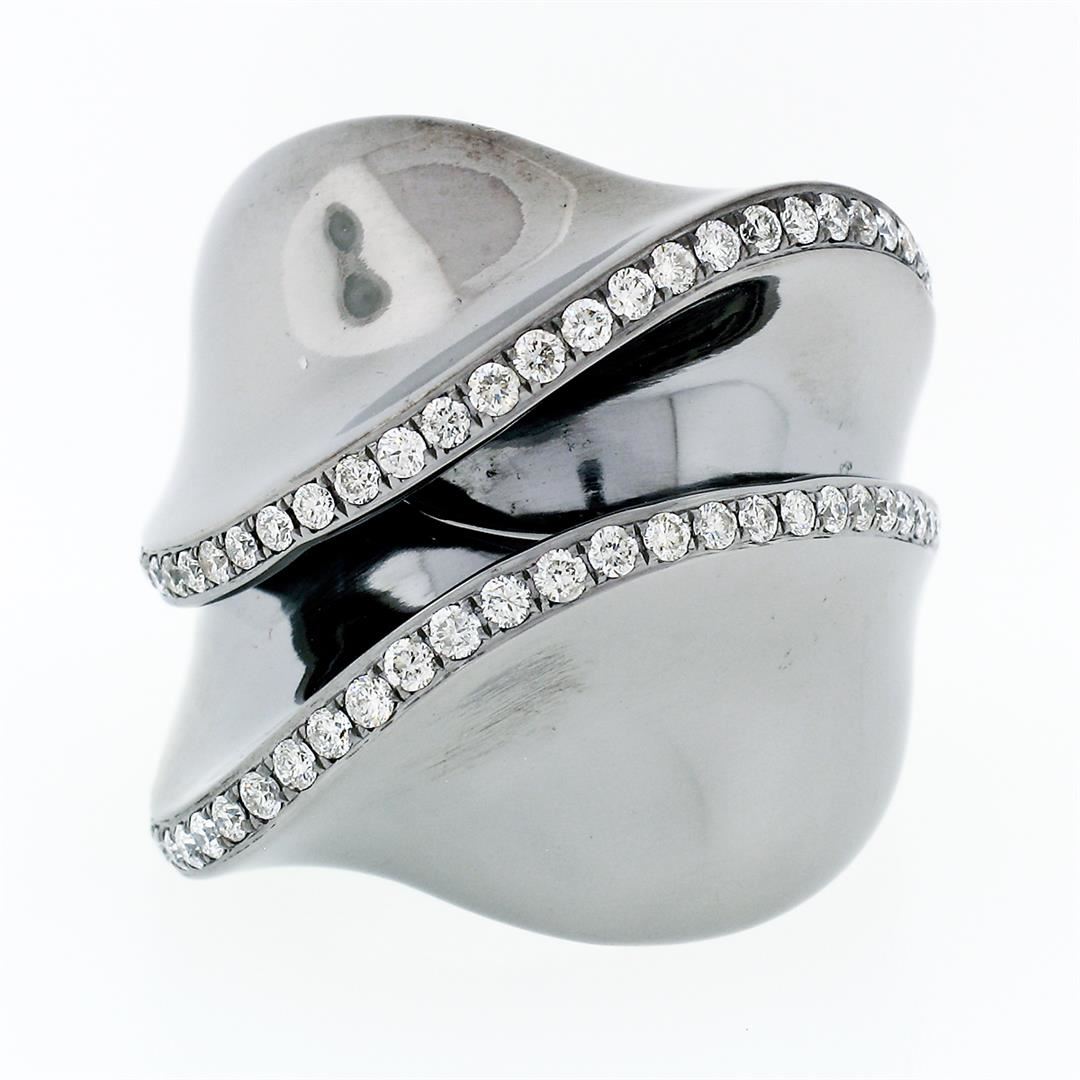 A modernist solid 18k gold ring plated with black rhodium and set with 55 round brilliant cut natural diamonds (G/H - VS1/VS2; 0.56ctw). The ring is size 7.0, weighs a total of 16.83 grams, and measures 22.27mm wide.
