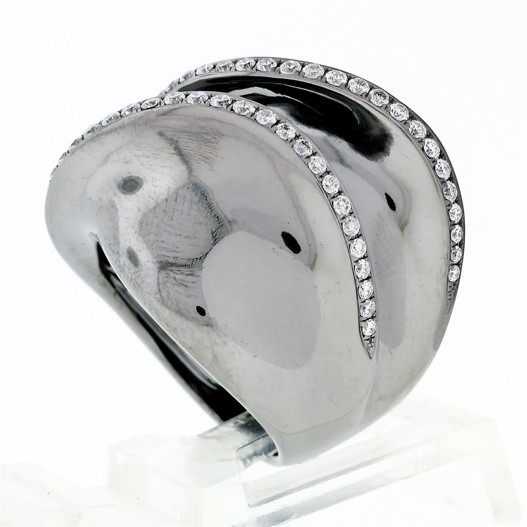 A modernist solid 18k gold ring plated with black rhodium and set with 55 round brilliant cut natural diamonds (G/H - VS1/VS2; 0.56ctw). The ring is size 7.0, weighs a total of 16.83 grams, and measures 22.27mm wide.