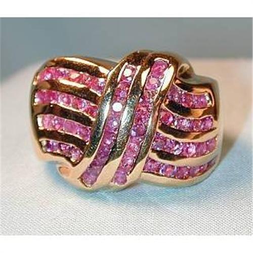 A newer estate ring in a large size. THe ring features 10 channels of Rubies (tested) in 18k (tested) yellow gold. The ring is a size 10 with a ring top measuring 3/4". The Rubies are light pink in hue and measure approximately .5mm each. The ring is in very good condition.