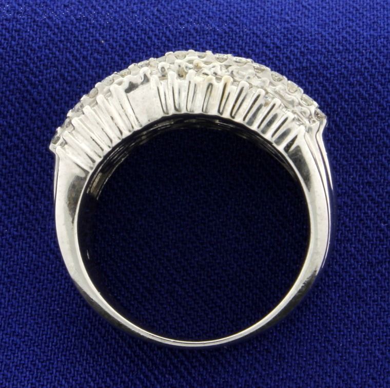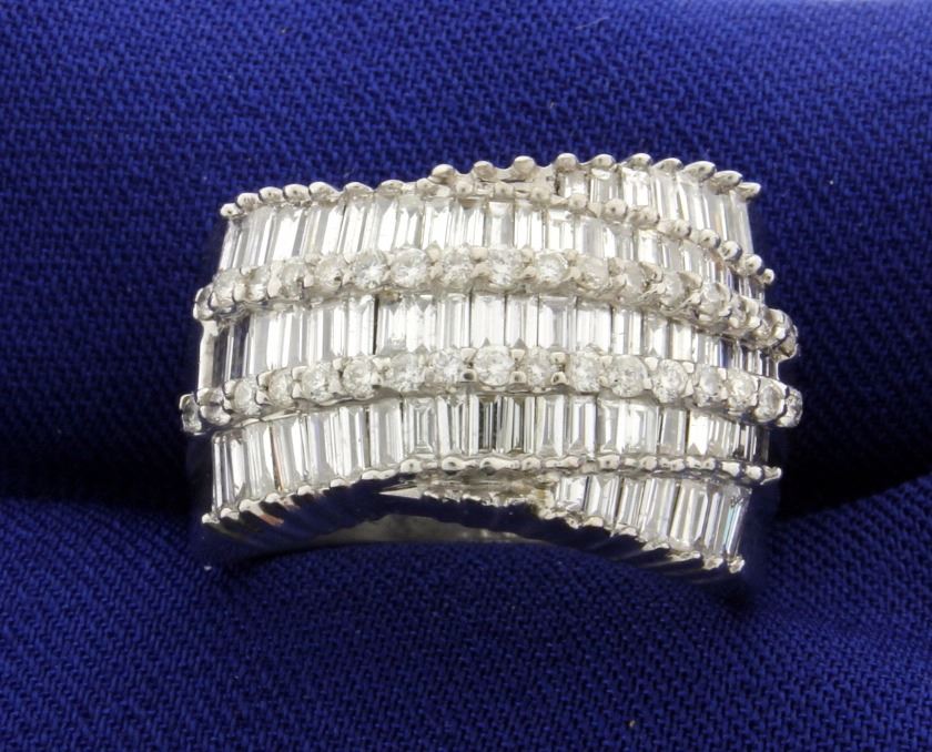The diamonds are brilliant cut round diamonds and beautiful white baguette diamonds. Clarity VS-SI and F-G-H colors. The top is 10mm across. The inside is azured for ease of cleaning. Size 7. 15.8g