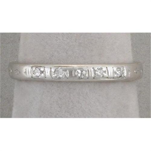 Interesting 18K ( marked 18K * Mermo Aclar Inc?) It is White Gold with Yellow Gold inlaid on the inside, (not a rhodium wash) and set with 5 approximatley 2 mm single -cut diamonds. Estimated to weigh a total of .10 carat. Remnants of engraving show wear. It is a size 7 1/2 and weighs 3.3 grams