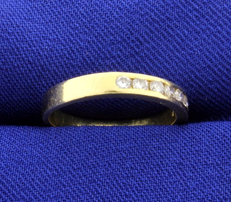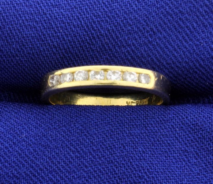 In 18K yellow gold, it is 3mm wide. It contains 1/4ct total weight of very high quality diamonds-VS clarity/F color. Size 6 2.8g