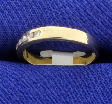 In 18K yellow gold, it is 3mm wide. It contains 1/4ct total weight of very high quality diamonds-VS clarity/F color. Size 6 2.8g