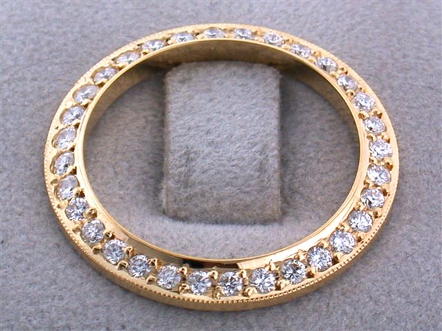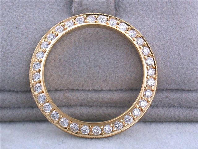 18k Yellow Gold Bezel with Diamonds - 1.0 carat in G color and VS clarity; approximately 1 inch in Diameter and weighs 5.0 grams