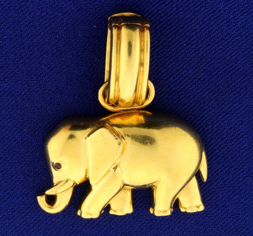 In 18k yellow gold. The elephant has a 1.25mm ruby as an eye. 1 1/2 inches long with bale that can open to accommodate up to a 12mm chain or omega. 1 1/4 inch wide. 15.5g.