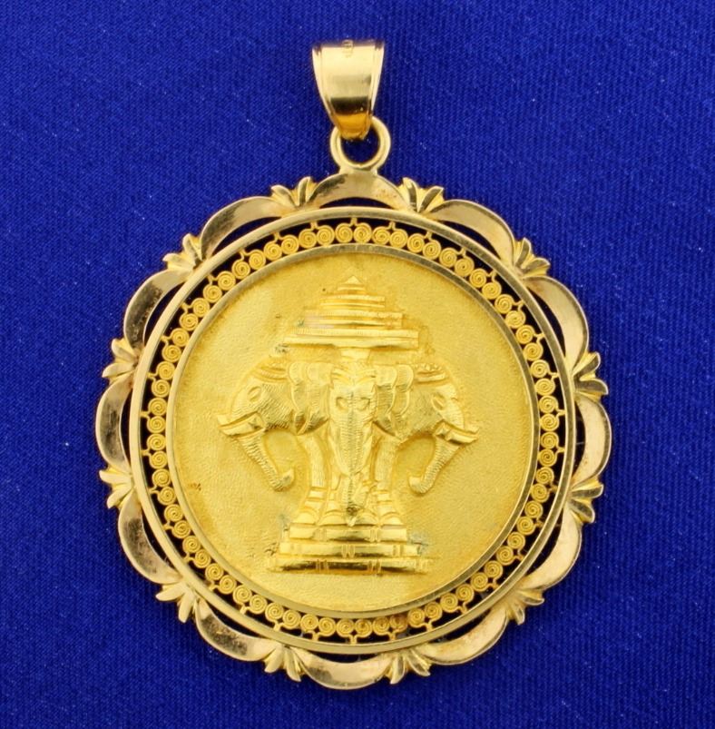 In 18k yellow gold this pendant is 2 3/8 inches long with bale. Has relief of 3 elephants on one side and Chinese symbols for health and happiness on the other       33.9g