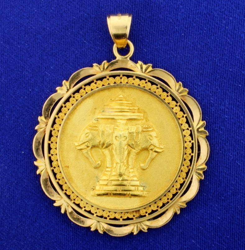 In 18k yellow gold this pendant is 2 3/8 inches long with bale. Has relief of 3 elephants on one side and Chinese symbols for health and happiness on the other 33.9g