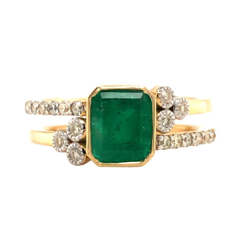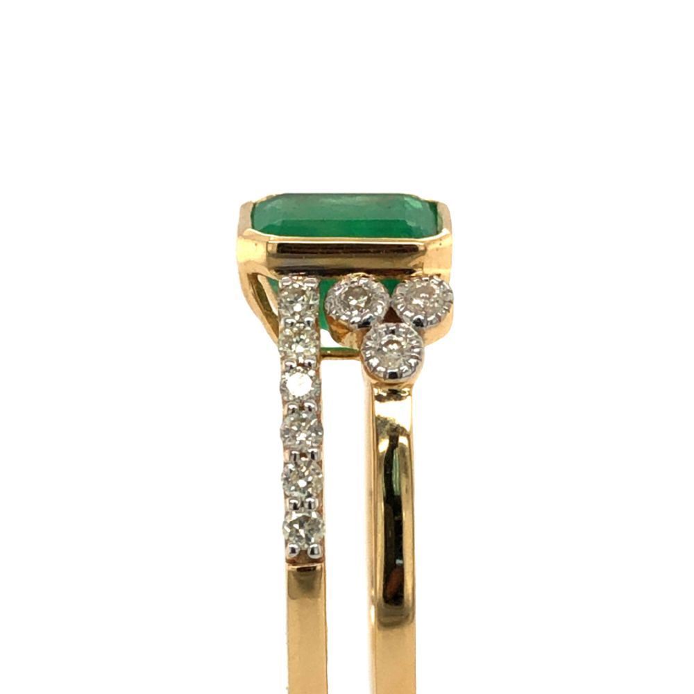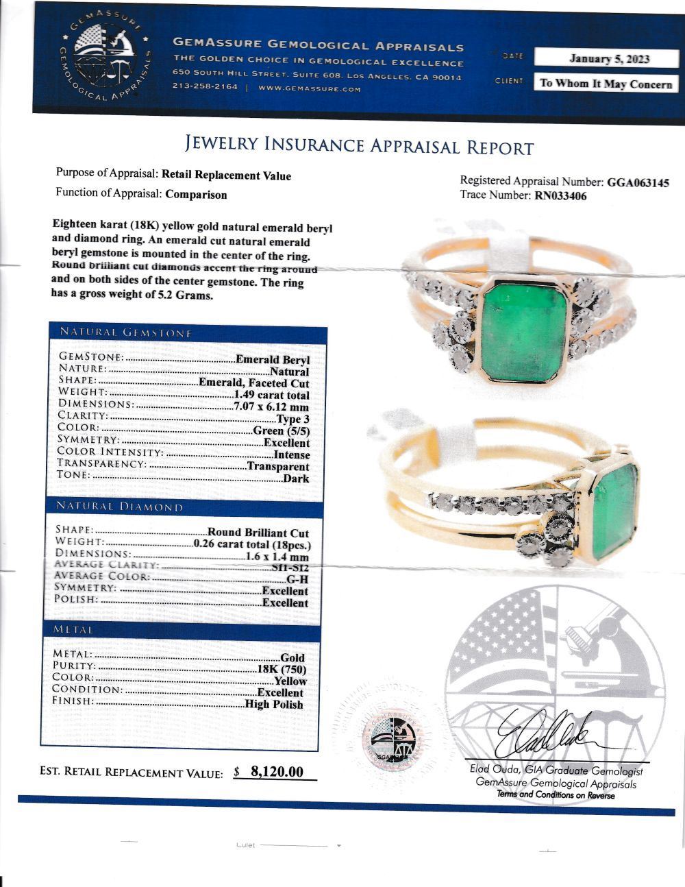 E6433/12 - LEN TITLE DESCRIPTION: 18k Emerald & Diamond Asymmetric Ring DESCRIPTION DETAIL: A unique rectangular shaped Emerald and Diamond double shank ring. The ring features a bezel set Emerald with round brilliant natural Diamonds on each side of the shank. OVERALL CONDITION: Excellent, New STONE: Emerald (Beryl) Shape: Emerald-Cut Weight: ~1.49 Carats Color: Green DIAMONDS: Natural Shape: Round, Brilliant-Cut Weight: ~0.26 Carats Total Weight Color: G-H Clarity: SI1-SI2 METAL: 18K Yellow Gold WEIGHT: 5.2 Grams SIZE: 6.75 DESIGNER: Oscar Friedman APPRAISAL DETAILS: This ring is certified and appraised for $8,120.00 estimated retail replacement value by GemAssure Gemological Appraisals (GGA). Please inquire about sizing, if needed and allow an additional 10 days for shipping if we resize it. THIS ITEM IS FROM AN ORDERED LIQUIDATION OF A MAJOR JEWELRY MANUFACTURER'S OVERSTOCKED INVENTORY. PRIOR TO BIDDING READ THE DESCRIPTION, TERMS, AND CONDITIONS CAREFULLY This description and condition report is provided for your convenience based on the information provided by the consignor. CAA is not responsible for any discrepancies between this information and other opinions. Buyers Premium: 18% Payment Due in 5 days All items shipped to registered address - NO EXCEPTIONS E6433/12 - LEN