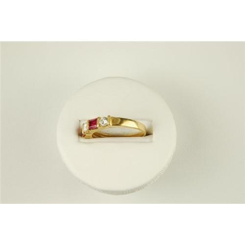 18k Yellow Gold Ring and Wedding Band featuring 3 FINE Quality Round Diamonds alternating with 2 Emerald Cut Rubys. The Diamonds are FINE 'VS' Qualtiy and FINE 'I' Color. The Diamond Total Weight = .25 CTS, and the Ruby Total Weight = .25 CTS ! This VERY FINE Quality ring is a Size 5 1/2 and I can easily resize it for you.