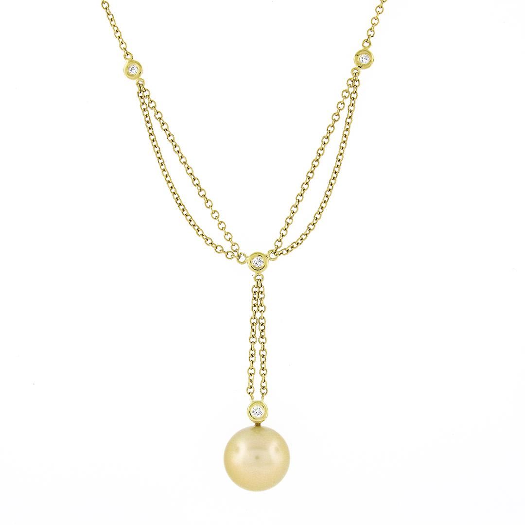 A solid 18k yellow gold dangle chain necklace, with 1 round shape golden cultured pearl (11.7mm), and 4 round brilliant cut natural diamonds (F/G - VS1/VS2 ; 0.12ctw). Adjustable 14.5 and16.5 inch single & dual cable link chain, 6.01 grams total weight, d