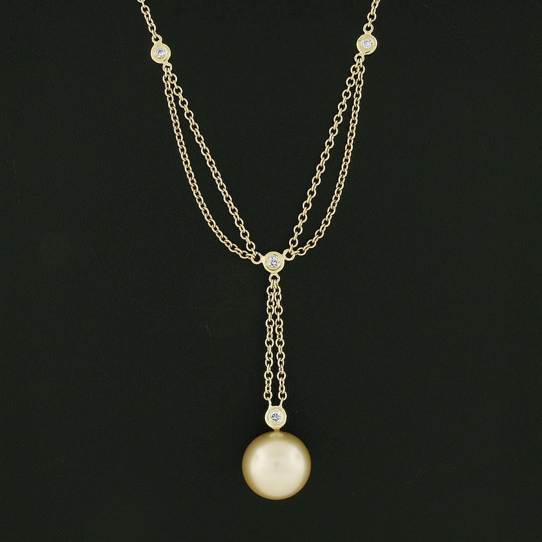 A solid 18k yellow gold dangle chain necklace, with 1 round shape golden cultured pearl (11.7mm), and 4 round brilliant cut natural diamonds (F/G - VS1/VS2 ; 0.12ctw). Adjustable 14.5 and16.5 inch single & dual cable link chain, 6.01 grams total weight, d