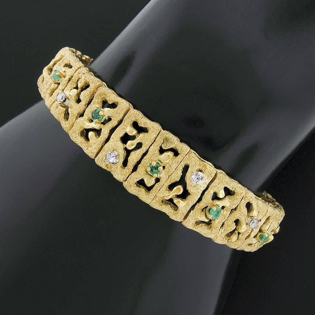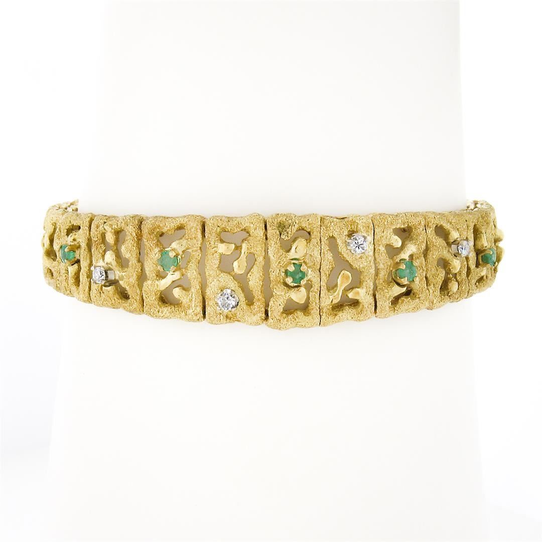 A solid 18k yellow gold strap bracelet, with 4 round brilliant cut natural diamonds (G/H Color - VS2 Clarity - 0.16ctw), and 5 round brilliant cut natural emeralds (0.35ctw). It weighs a total of 39.31 grams, measures 14.45mm wide, and measures 6.5 inches in length.