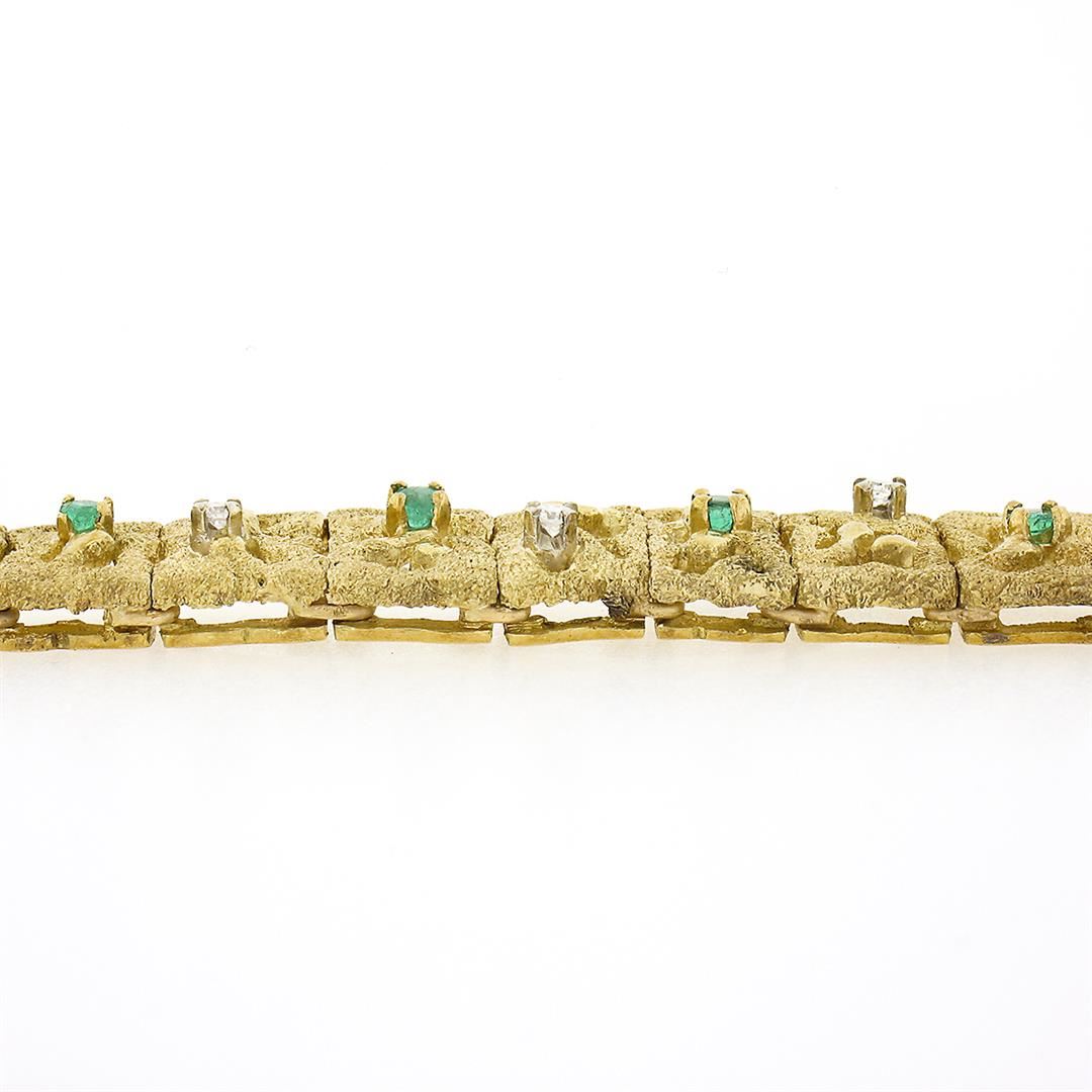 A solid 18k yellow gold strap bracelet, with 4 round brilliant cut natural diamonds (G/H Color - VS2 Clarity - 0.16ctw), and 5 round brilliant cut natural emeralds (0.35ctw). It weighs a total of 39.31 grams, measures 14.45mm wide, and measures 6.5 inches in length.