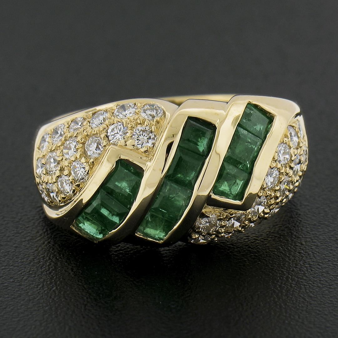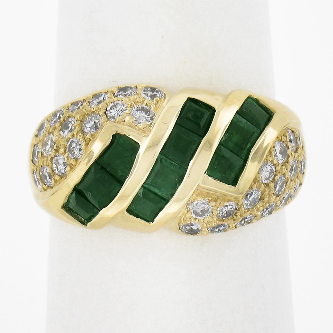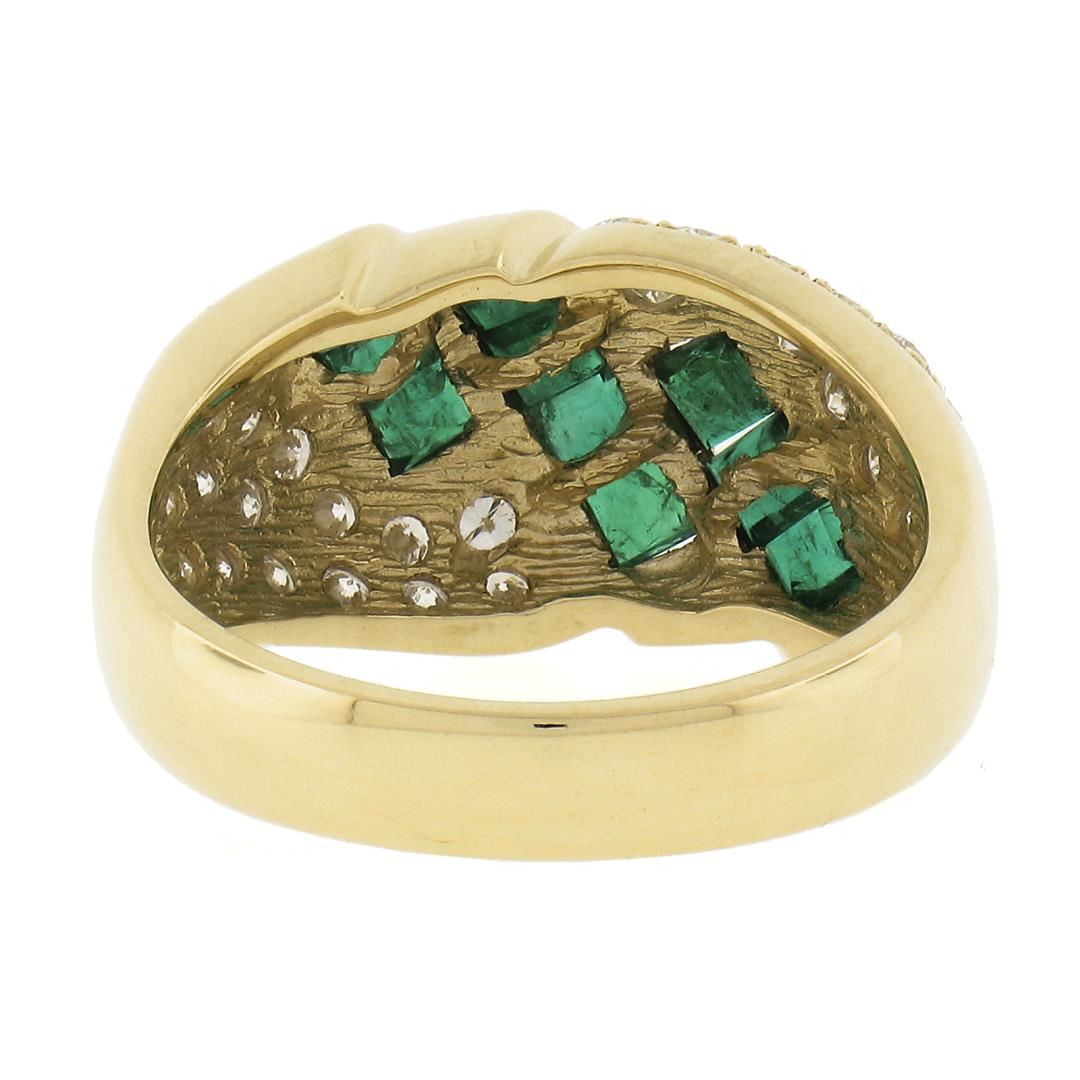 A solid 18k yellow gold band ring, with 10 square step cut natural emeralds (1.0ctw ), and 32 round cut natrual diamonds (F/G Color - VS1-SI1 Clarity - 0.65ctw). The ring is size 6.5, weighs a total of 6.33 grams, and measures 10.4mm wide.