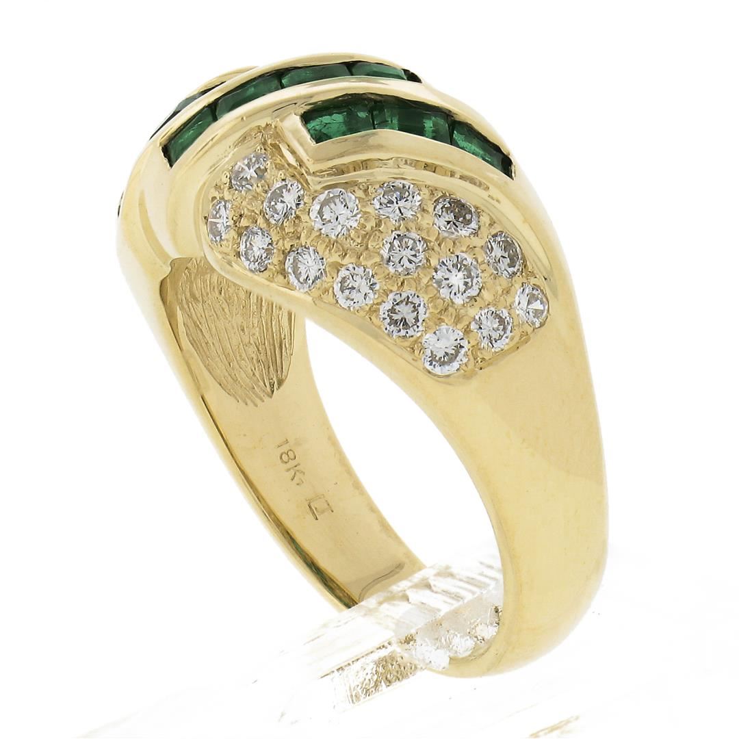 A solid 18k yellow gold band ring, with 10 square step cut natural emeralds (1.0ctw ), and 32 round cut natrual diamonds (F/G Color - VS1-SI1 Clarity - 0.65ctw). The ring is size 6.5, weighs a total of 6.33 grams, and measures 10.4mm wide.