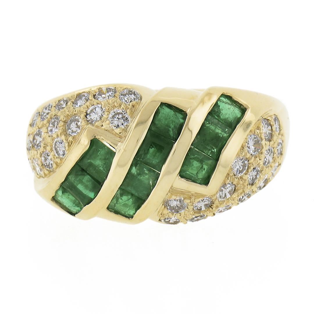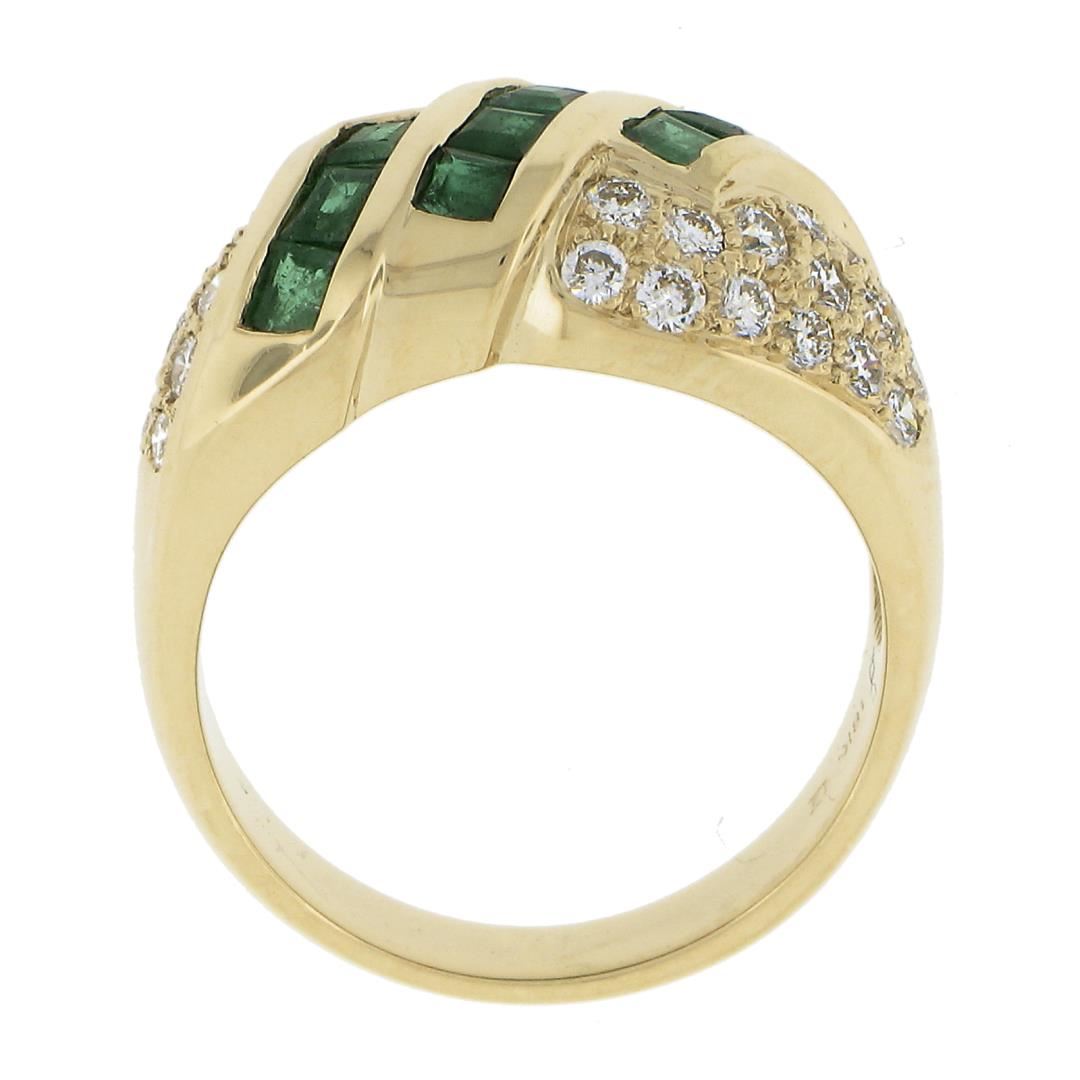 A solid 18k yellow gold band ring, with 10 square step cut natural emeralds (1.0ctw ), and 32 round cut natrual diamonds (F/G Color - VS1-SI1 Clarity - 0.65ctw). The ring is size 6.5, weighs a total of 6.33 grams, and measures 10.4mm wide.