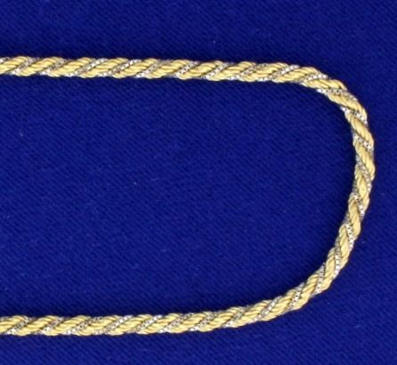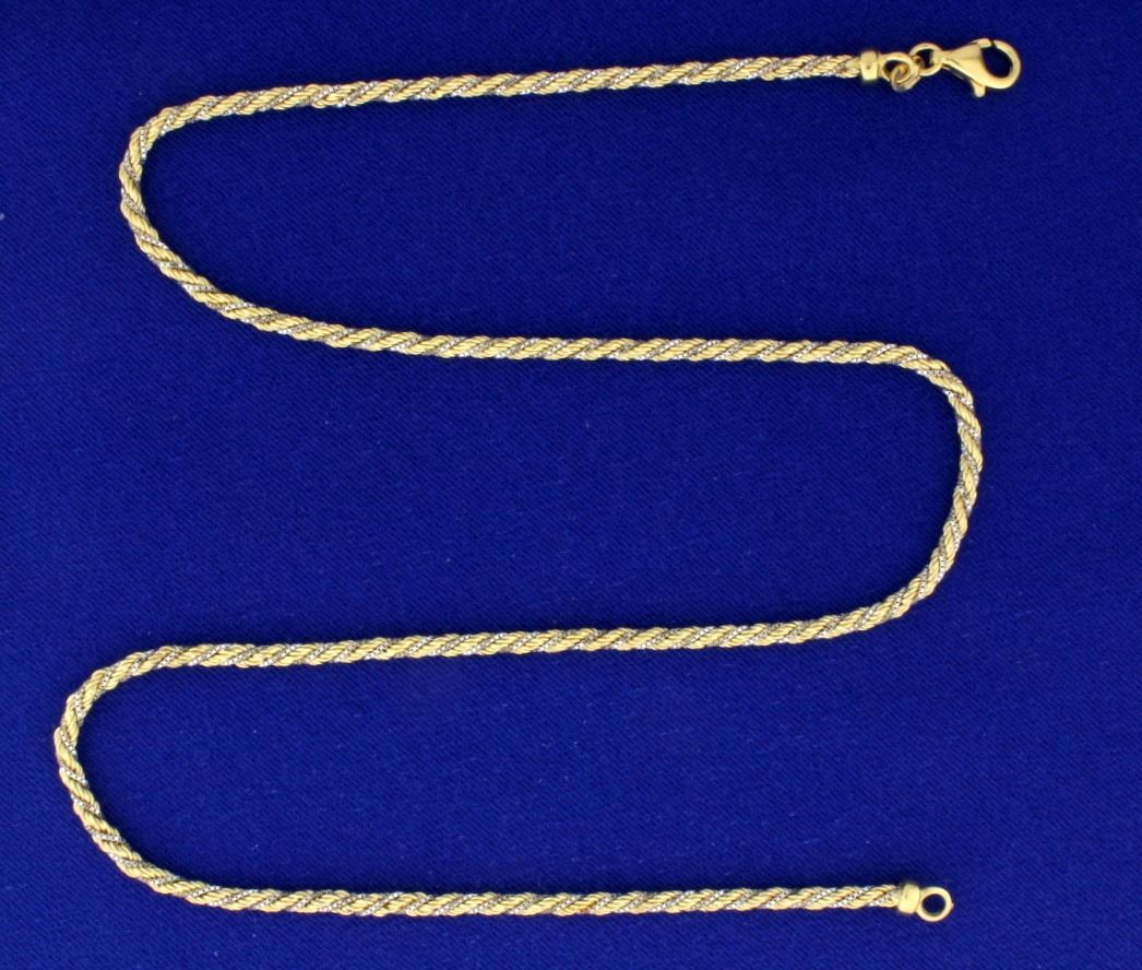 In 18k yellow and white gold. Contains a white gold strand of box link and a yellow gold strand of rope style. 2.7mm thick with lobster clasp. 11.5g.