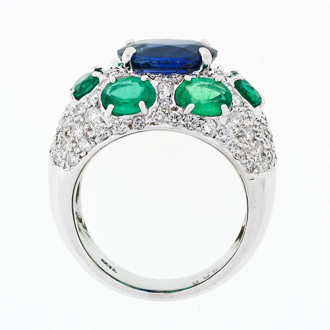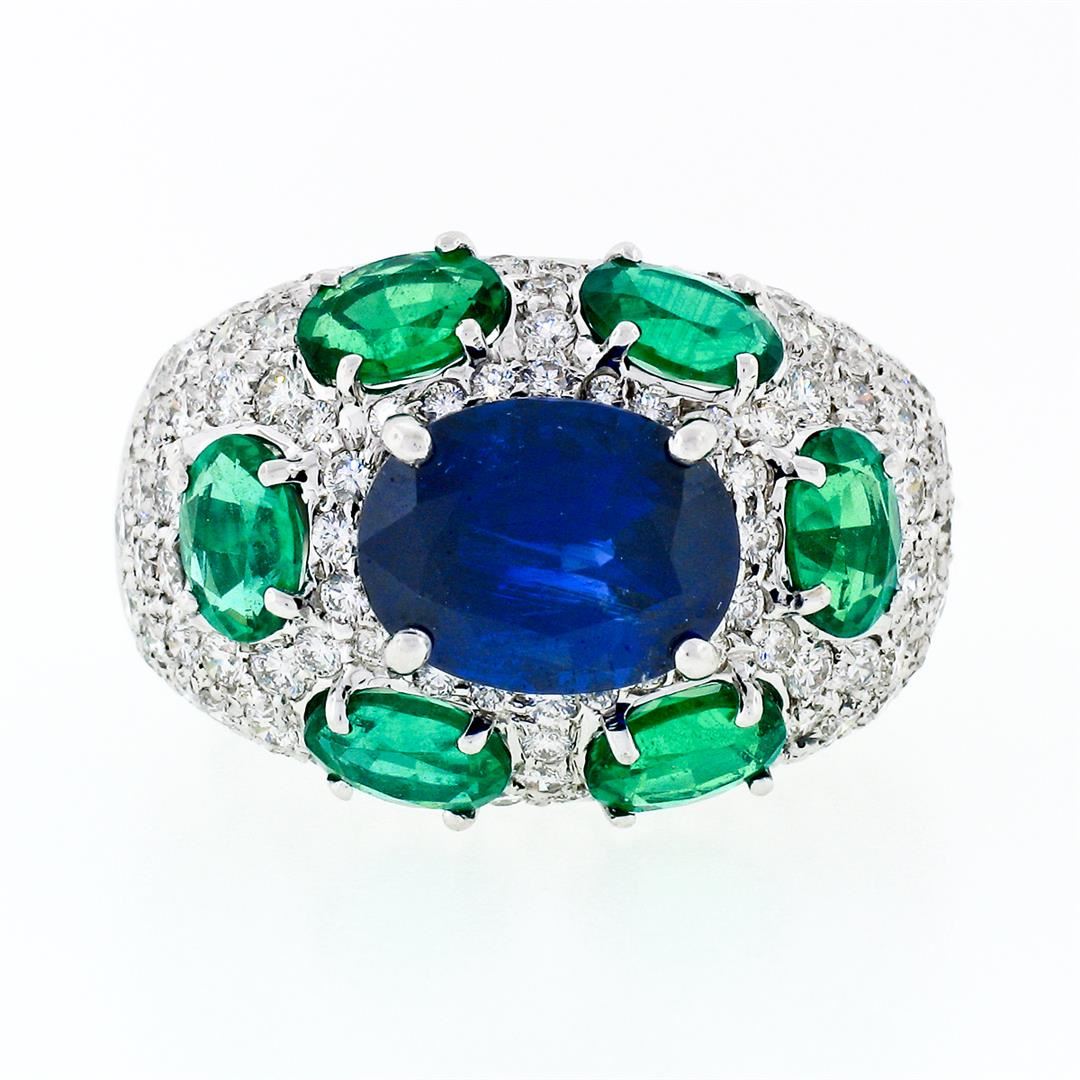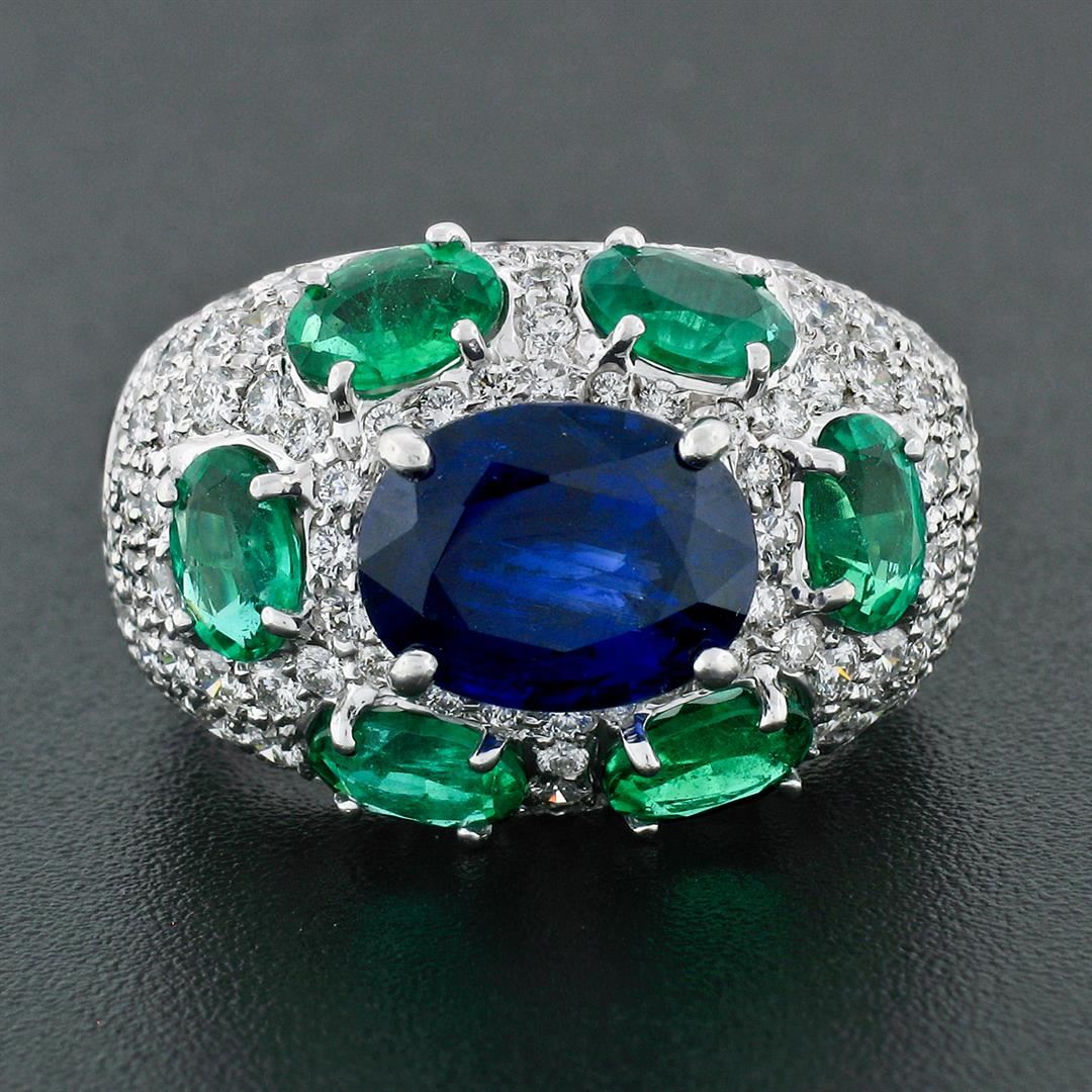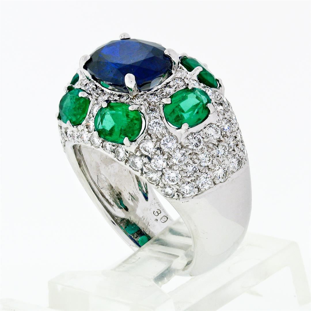 A solid 18k white gold ring with 1 GIA and AGL certified oval cut natural burma sapphire (3.08ct) surrounded by 6 oval brilliant cut natural emeralds (2.10ctw) and 97 round brilliant cut natural diamonds (VVS2/VS1 - F/G; 1.75ctw). The ring is size 5.5, weighs a total of 12.07 grams, and measures 14.25mm wide. Comes with all original relevant certifications.