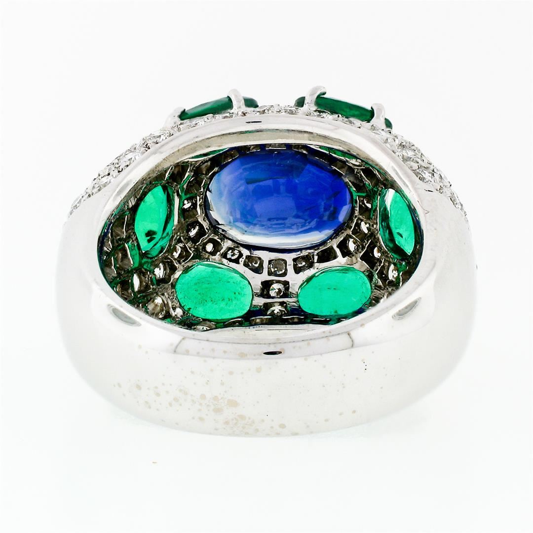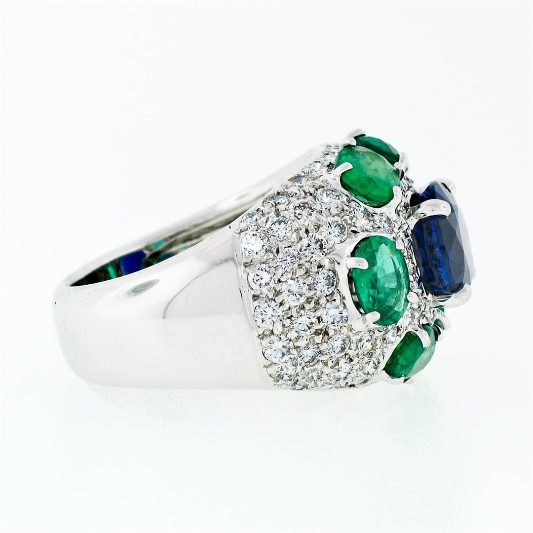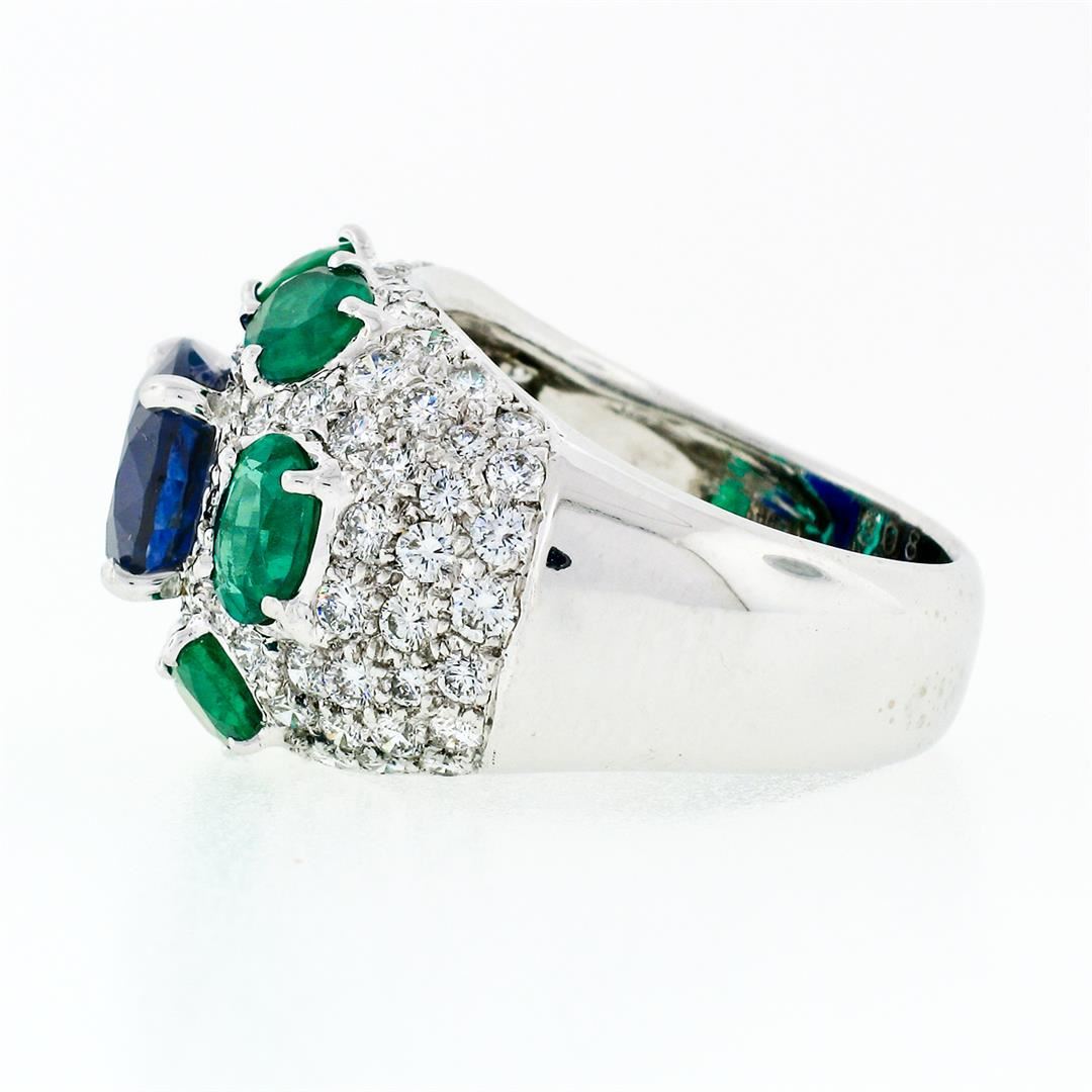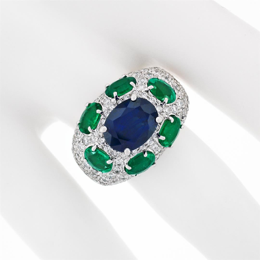 A solid 18k white gold ring with 1 GIA and AGL certified oval cut natural burma sapphire (3.08ct) surrounded by 6 oval brilliant cut natural emeralds (2.10ctw) and 97 round brilliant cut natural diamonds (VVS2/VS1 - F/G; 1.75ctw). The ring is size 5.5, weighs a total of 12.07 grams, and measures 14.25mm wide. Comes with all original relevant certifications.