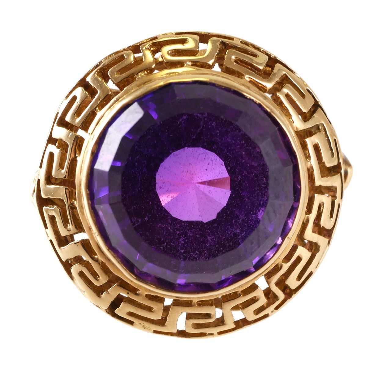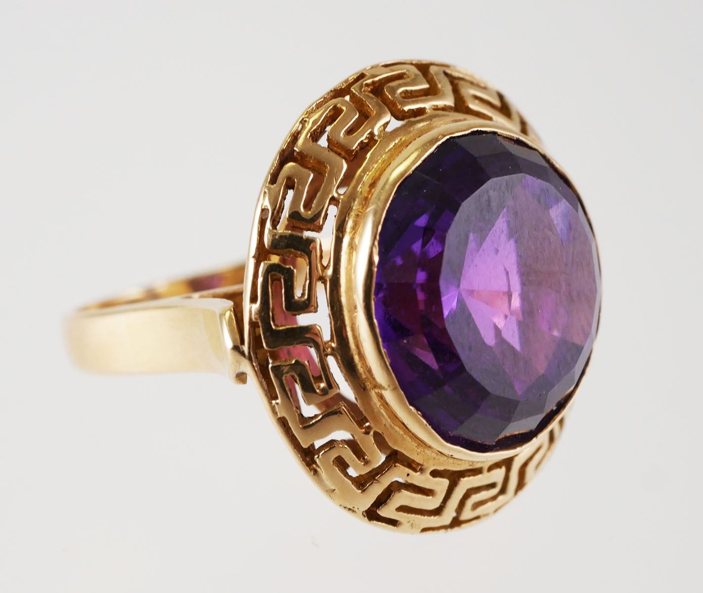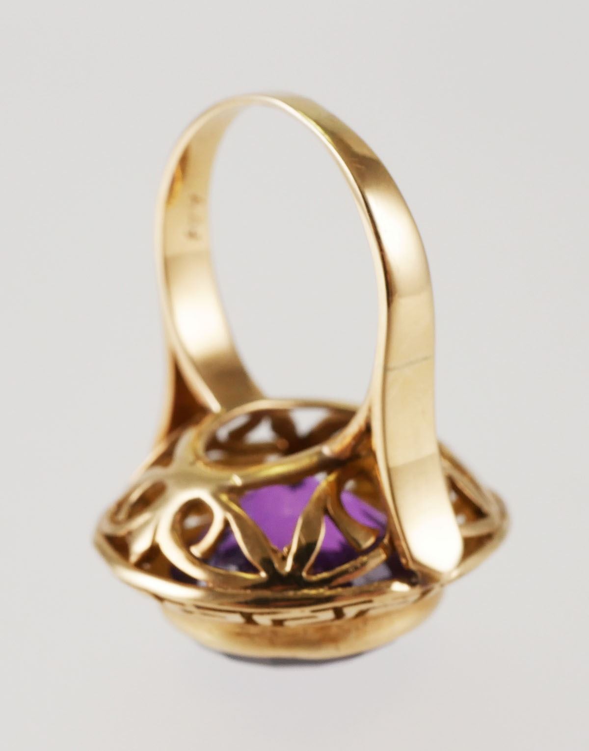Stunning vintage 18k yellow gold ring with an approximately 10-carat amethyst. Total weight is 11.9 grams. Size 7-1/2, resizable.