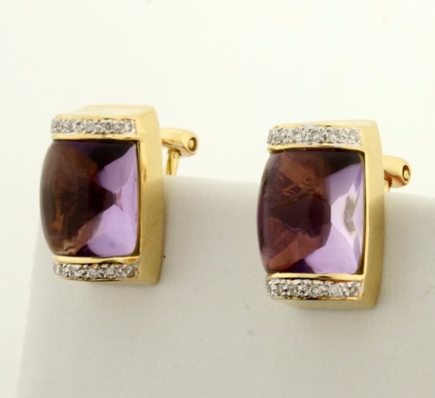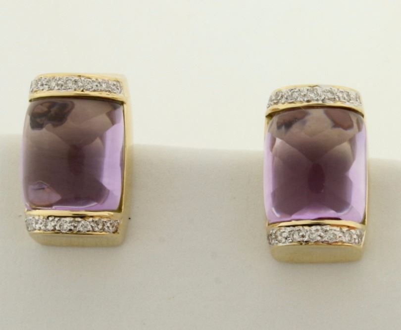 In 18k yellow gold. Contains two 10mm beautifully cut dome shaped natural amethyst gemstones with excellent clarity and bright purple color. Also contains twenty eight high quality .01ct diamonds of Vs clarity/H color. French backs with posts for pierced ears. 1/2 inch long 7.8g.