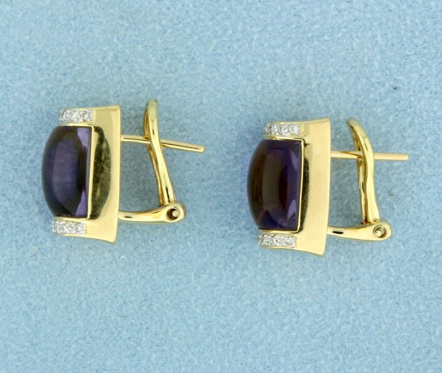 In 18k yellow gold. Contains two 10mm beautifully cut dome shaped natural amethyst gemstones with excellent clarity and bright purple color. Also contains twenty eight high quality .01ct diamonds of Vs clarity/H color. French backs with posts for pierced ears. 1/2 inch long 7.8g.
