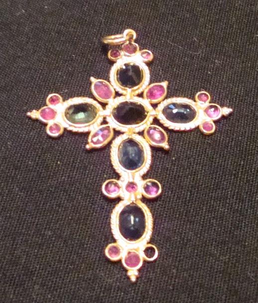 Very pretty 14k yellow gold cross with rubies & topaz gems.