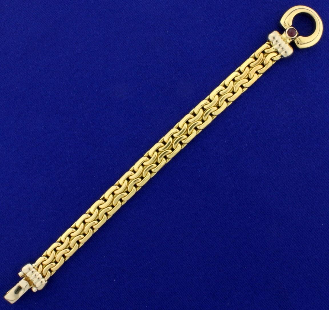 In 18k yellow and white gold. Bracelet has curved and flat "C" links with a high quality 3.5mm cabochon ruby gemstone bezel-set at clasp end of bracelet. Clasp secures around oversized gold loop. 7.25” long. 26.7g