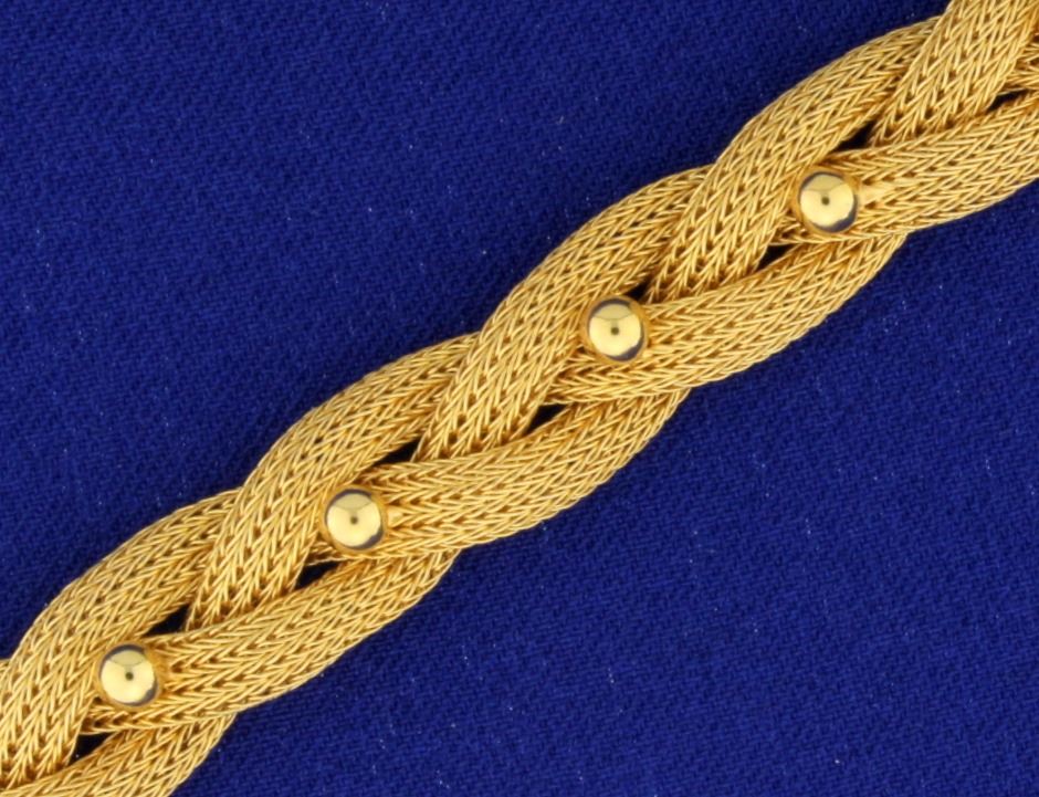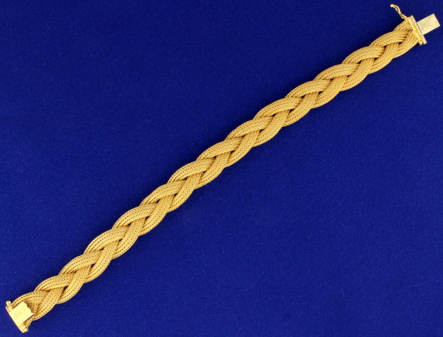 In 18k yellow gold. 7 1/2" long and 3/8" wide with safety clasp. 24.6g.