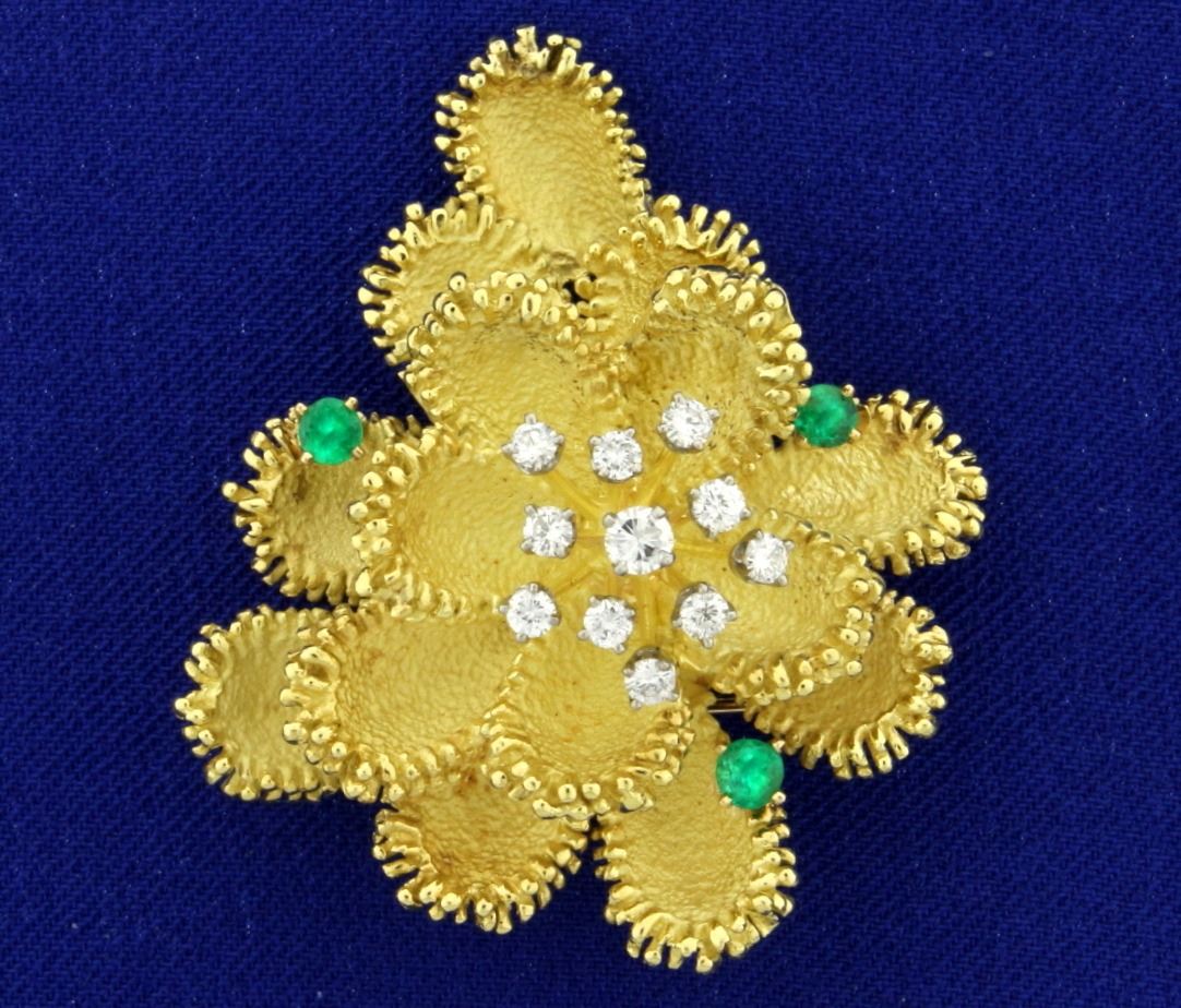In 18k yellow gold. Contains three 3mm high quality emeralds with bright green color and excellent clarity. Also contains 1/2ct of high quality diamonds with SI1 clarity/F color. 1 3/4" long. 21.9g.
