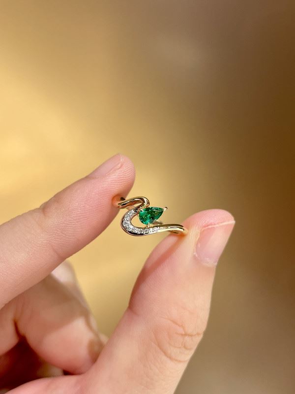 This 18k gold ring features a beautiful emerald at its center, surrounded by sparkling diamonds, showcasing a minimalist yet sophisticated design. The vibrant green of the emerald, complemented by the brilliance of the diamonds, creates a stylish and elegant piece, perfect for any occasion.Ring size: 6, circumference: 52 mm, diameter: 16.2 mm, total weight: 1.88g.