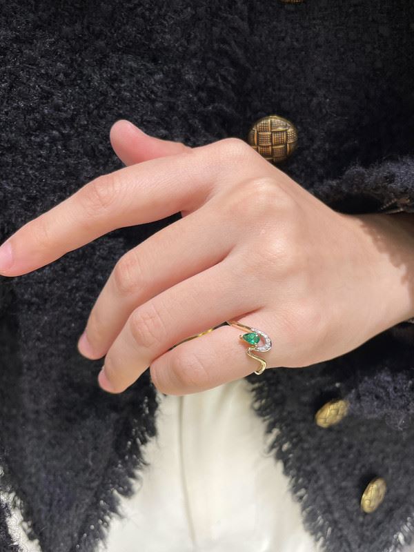 This 18k gold ring features a beautiful emerald at its center, surrounded by sparkling diamonds, showcasing a minimalist yet sophisticated design. The vibrant green of the emerald, complemented by the brilliance of the diamonds, creates a stylish and elegant piece, perfect for any occasion.Ring size: 6, circumference: 52 mm, diameter: 16.6 mm, total weight: 1.88g.Note: GUILD certificate, comes with a jewelry, gemstone, and precious metal authentication certificate.