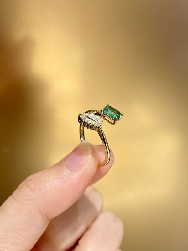 This 18k gold ring features a unique design with a beautiful emerald alongside a sparkling diamond, showcasing a modern and minimalist style. The vibrant green of the emerald complements the brilliance of the diamond, creating a perfect blend of luxury and elegance, ideal for both everyday wear and special occasions.Ring size: 6, circumference: 52 mm, diameter: 16.6 mm, total weight: 2.87g.Note: GUILD certificate, comes with a jewelry, gemstone, and precious metal authentication certificate.