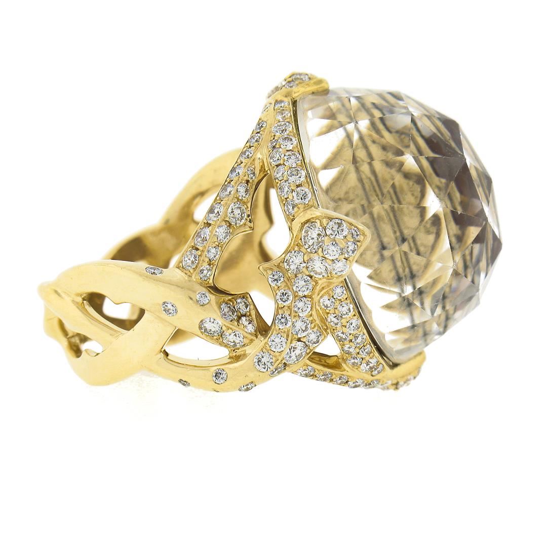 A solid 18k yellow gold ring, with 1 faceted round shape rock crystal on top of black mother of pearl (19.9mm), and numerous of round cut natural diamonds (F/G - VS1/VS2 ; 1.20ctw). The ring is size 9.0, weighs a total of 17.93 grams, and measures 23.2mm wide.