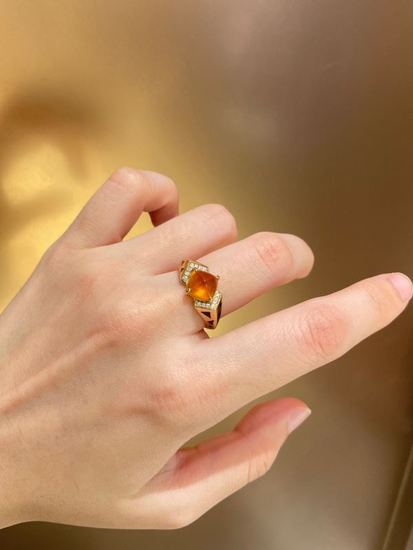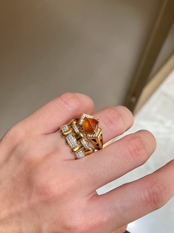 This 18k gold ring features a stunning Fanta gemstone at its center, surrounded by delicate diamonds, showcasing a unique design with a luxurious feel. The warm hue of the Fanta gemstone pairs beautifully with the brilliance of the diamonds, creating a bold and elegant piece, perfect for formal occasions.Ring size: 6, circumference: 52 mm, diameter: 16.6 mm, total weight: 5.14g.Note: GUILD certificate, comes with a jewelry, gemstone, and precious metal authentication certificate.