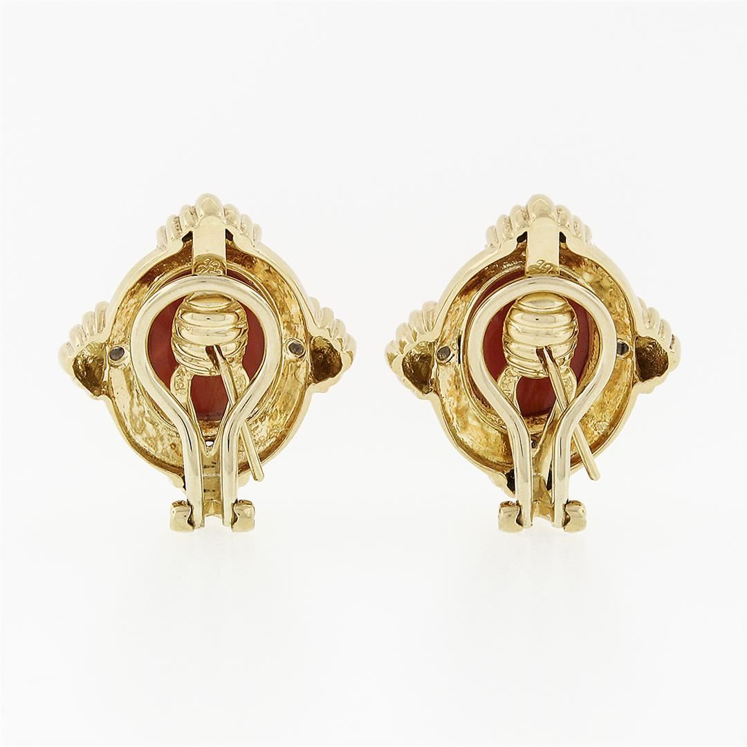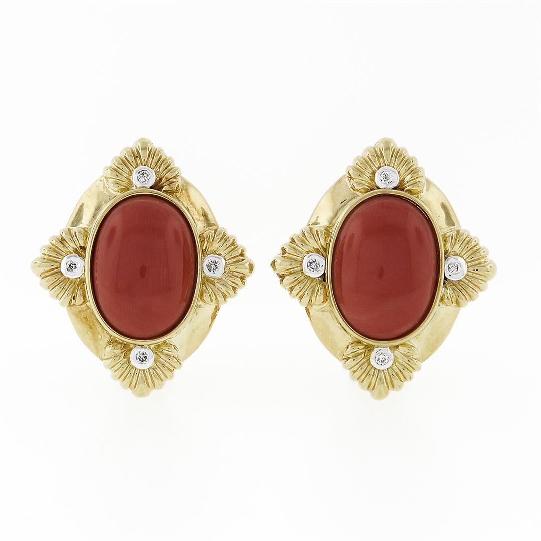 A solid 18k yellow gold clip on pair of earrings, with 2 Gia certified oval cabochon cut natural corals (13.77 x 9.95 x 4.60 mm and 13.79 x 10.04 x 4.62 mm), and 8 round brilliant cut natural diamonds (G- VS2; 0.12ctw). The earrings measure approximately 25.67x22.09mm and weigh a total of 17.24 grams. Comes with all original relevant certifications.