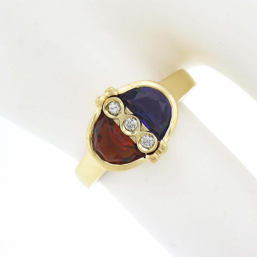 A solid 18k yellow gold ring, with 1 half moon cut natural spessartite garnet (7x4.4mm), 1 half moon cut natural amethyst (7x4.4mm), and 3 round brilliant cut natural diamonds (G/H - VS2 ; 0.06ctw). The ring is size 5.0, weighs a total of 3.82 grams, and measures 10.1mm wide.