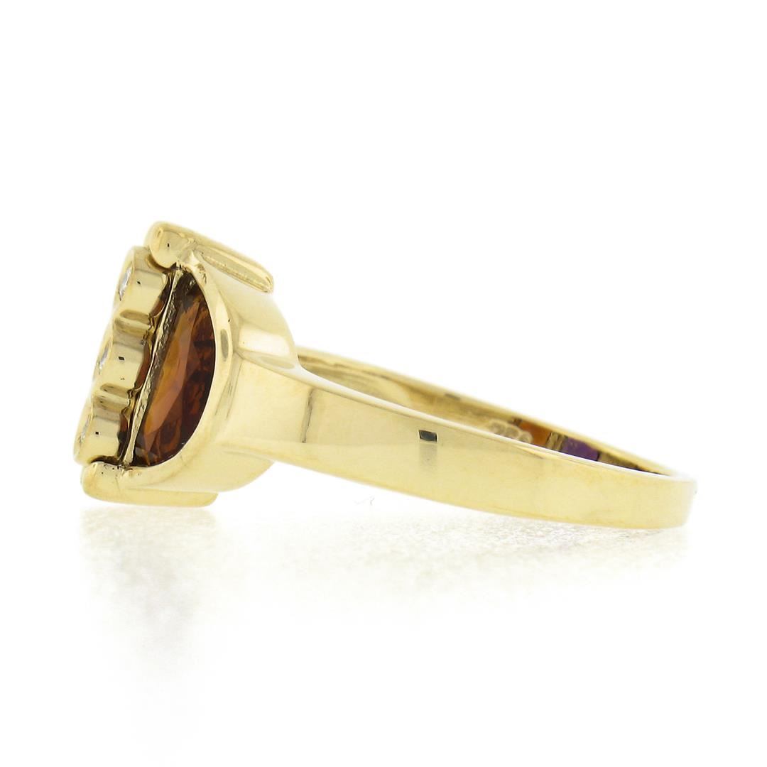 A solid 18k yellow gold ring, with 1 half moon cut natural spessartite garnet (7x4.4mm), 1 half moon cut natural amethyst (7x4.4mm), and 3 round brilliant cut natural diamonds (G/H - VS2 ; 0.06ctw). The ring is size 5.0, weighs a total of 3.82 grams, and measures 10.1mm wide.