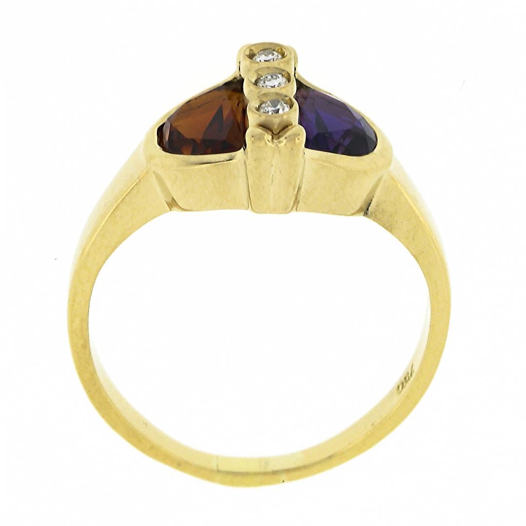 A solid 18k yellow gold ring, with 1 half moon cut natural spessartite garnet (7x4.4mm), 1 half moon cut natural amethyst (7x4.4mm), and 3 round brilliant cut natural diamonds (G/H - VS2 ; 0.06ctw). The ring is size 5.0, weighs a total of 3.82 grams, and measures 10.1mm wide.