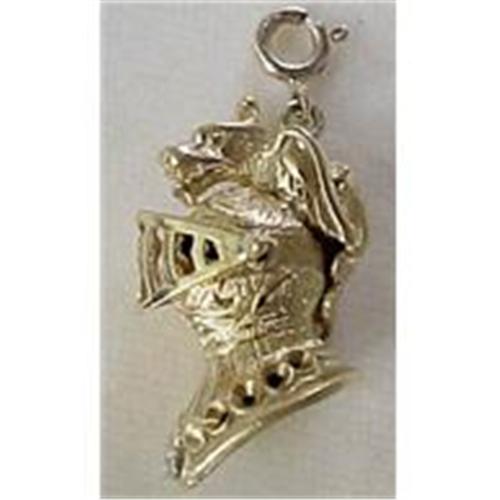 This is a wonderful 18k yellow gold charm in the form of a knight's helm. The helm is topped with a dragon's head with wings. The charm measures 1 1/4" x 5/8" and the visor moves up and down. It weighs 8.4 grams and is in excellent condition. It is not marked, but tests 18k gold.